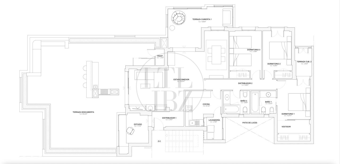La propiedad cuenta con 113,78 m² construidos y destaca por su impresionante terraza privada de 121,51 m², uno de los grandes atractivos de la vivienda. Este amplio espacio exterior ofrece un enorme potencial para crear diferentes ambientes como zona chill out, comedor al aire libre o solárium, y permite disfrutar de vistas abiertas a Dalt Vila, uno de los iconos más representativos de la isla.