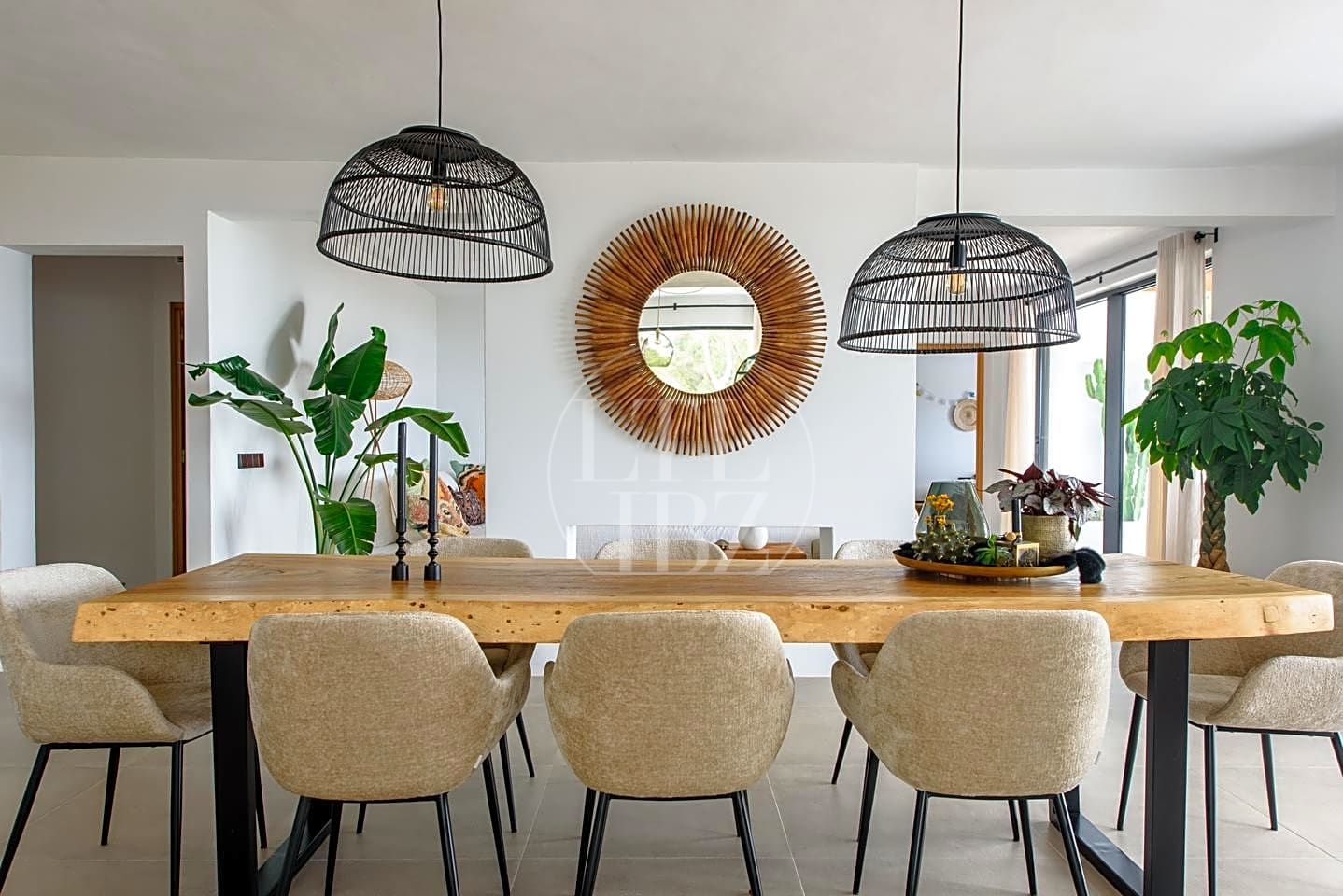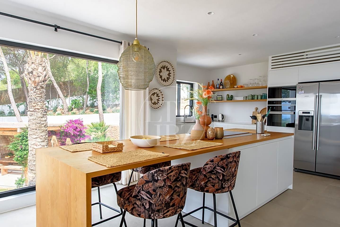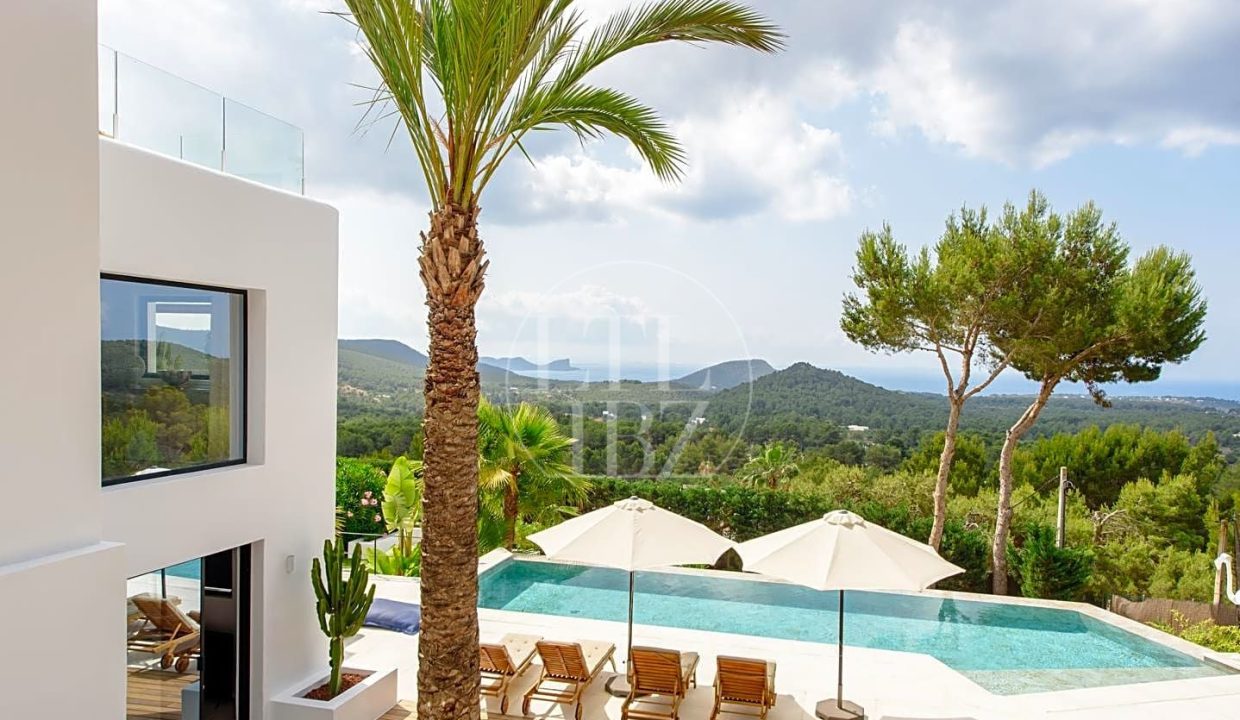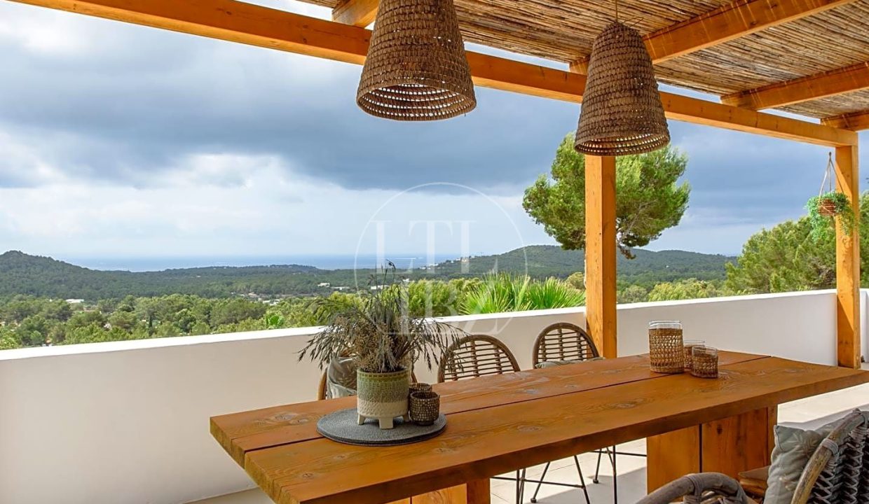 Impresionante villa en Es Cubells de 400m2, situada en una parcela de 2.600m2. Escondido en un lugar tranquilo, te ofrece impresionantes vistas panorámicas del mar y las montañas, prometiendo una escapada idílica.