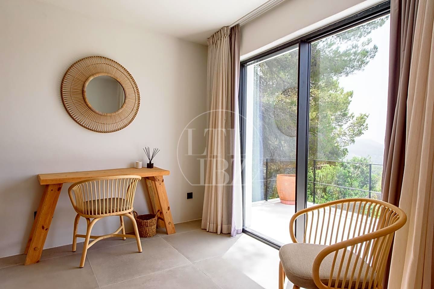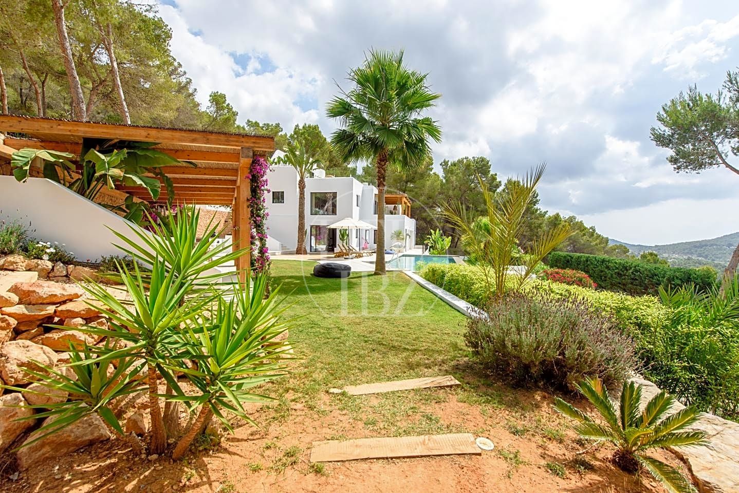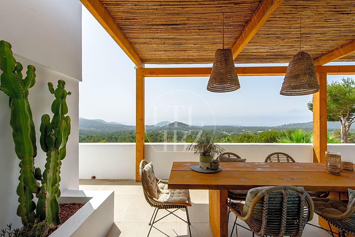 Impresionante villa en Es Cubells de 400m2, situada en una parcela de 2.600m2. Escondido en un lugar tranquilo, te ofrece impresionantes vistas panorámicas del mar y las montañas, prometiendo una escapada idílica.
