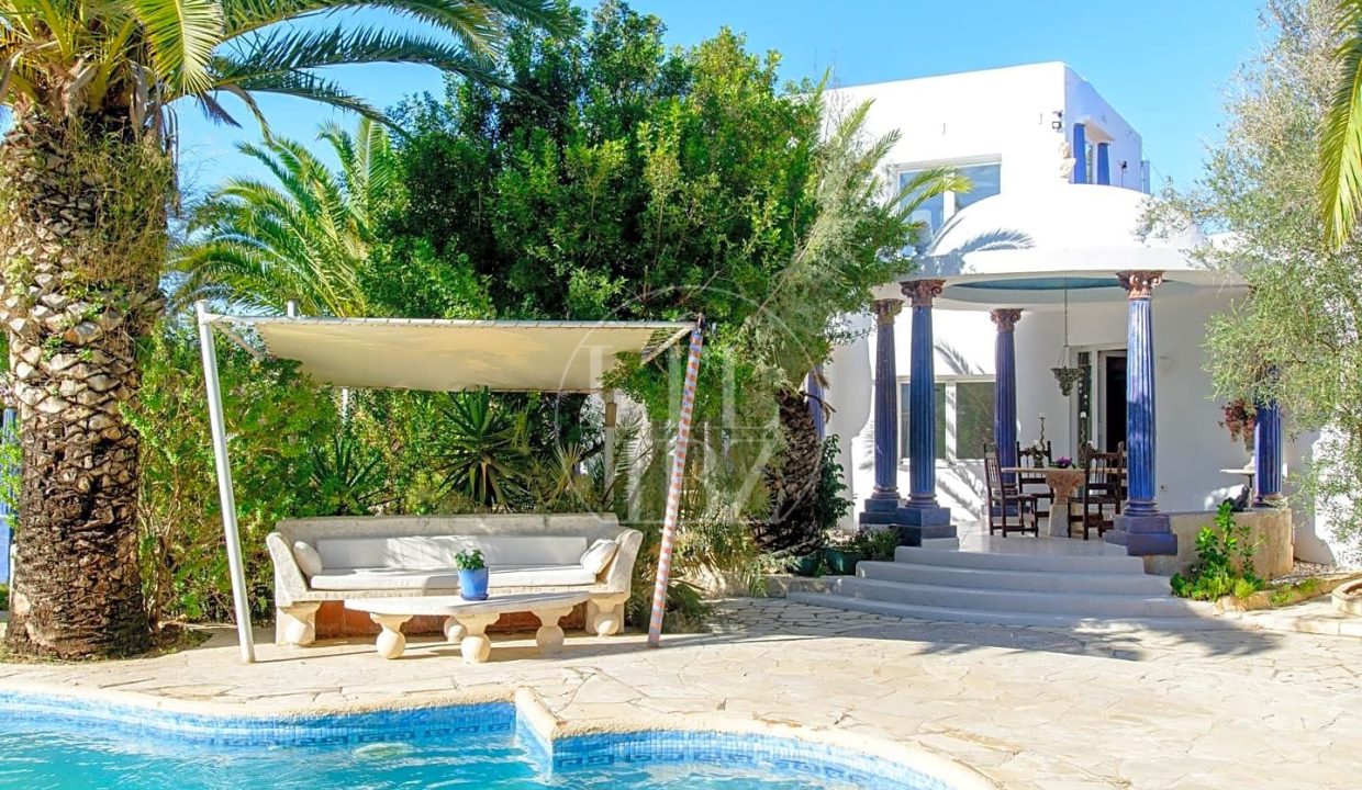 Interesante villa a la venta con licencia turística, ubicada en la zona de San José, con vistas al mar y al monte, para aquellos que buscan tranquilidad y al mismo tiempo poder llegar fácilmente a Ibiza ciudad.