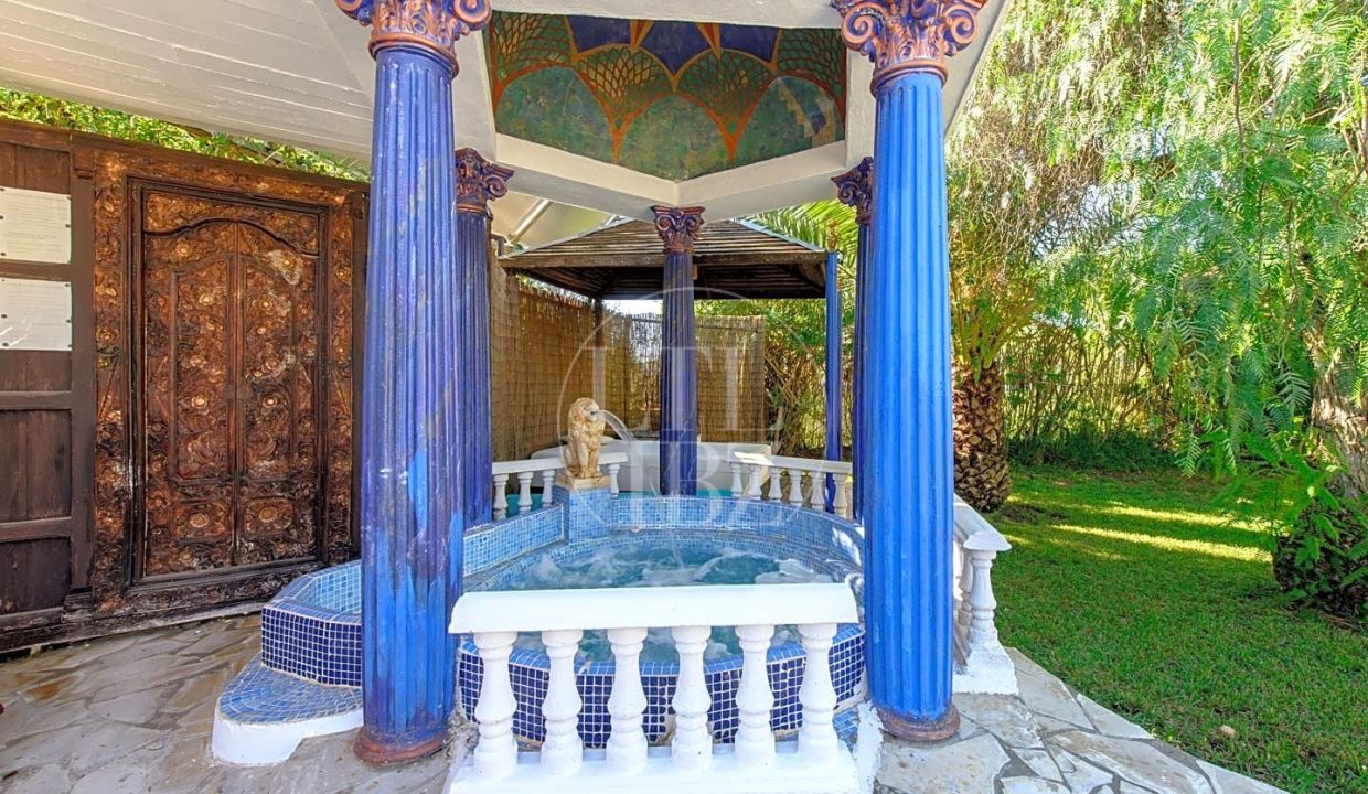 En el exterior, se encuentran jardines con plantas tropicales y hermosas palmeras, ducha exterior, piscina, barbacoa, jacuzzi climatizado entre columnas y una zona al fresco para almorzar. Los paneles solares proporcionan agua caliente para el jacuzzi con la posibilidad de añadirlo para calentar también la piscina.