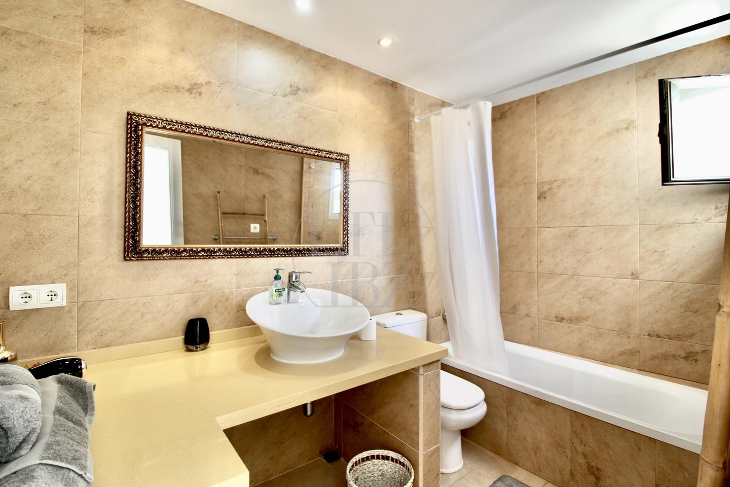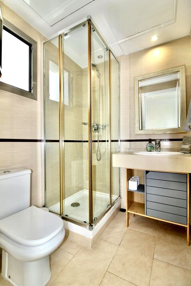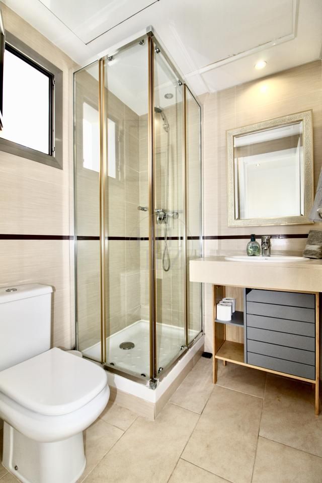 Suba las escaleras detrás del sofá, situado justo enfrente de la entrada, para llegar al nivel superior que alberga dos habitaciones dobles con baño. El primer dormitorio tiene una terraza privada, ideal para crear tu espacio chill-out personal, mientras que el segundo dormitorio cuenta con una pequeña terraza con vistas a la calle principal.