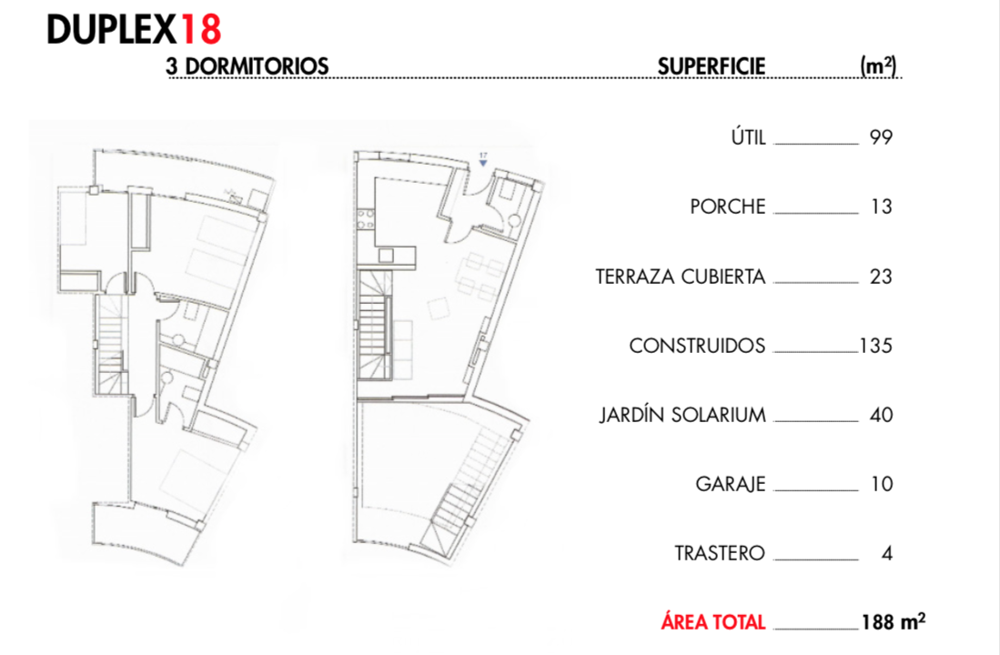 The apartments have between 180m2 and 190m2 built on 2 floors + roof terrace. They all have three bedrooms, 2 bathrooms, a solarium garden, a covered terrace, a walkable roof terrace, as well as a garage and storage room included in the price.