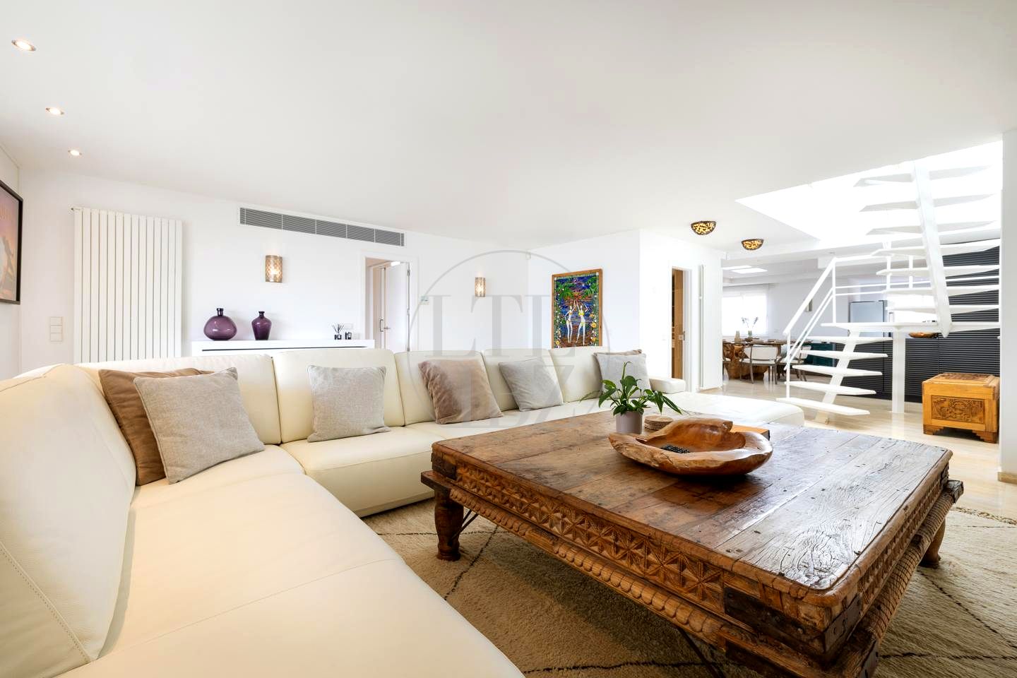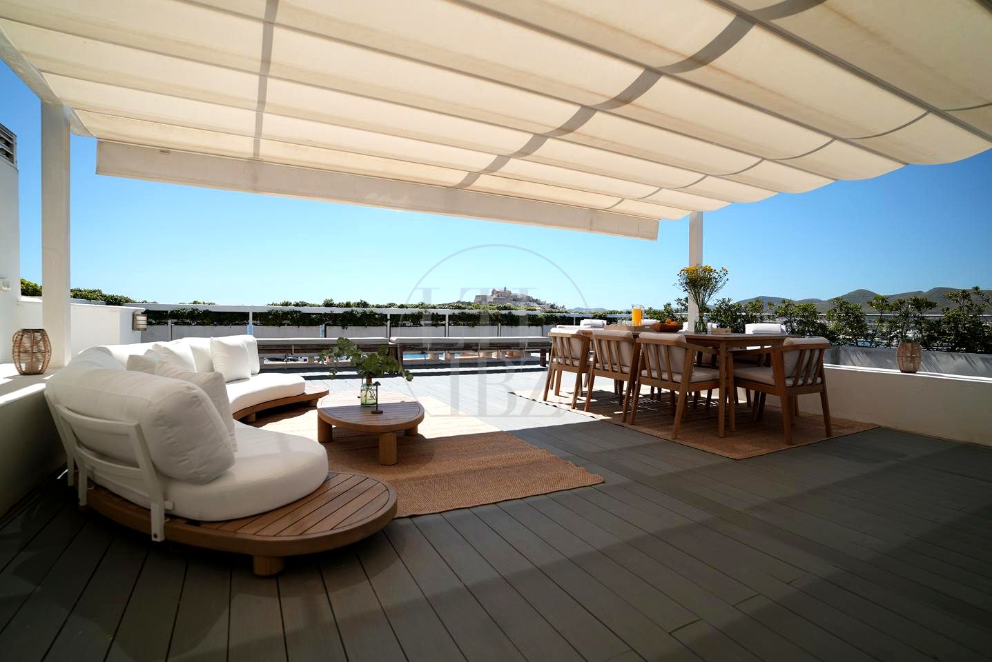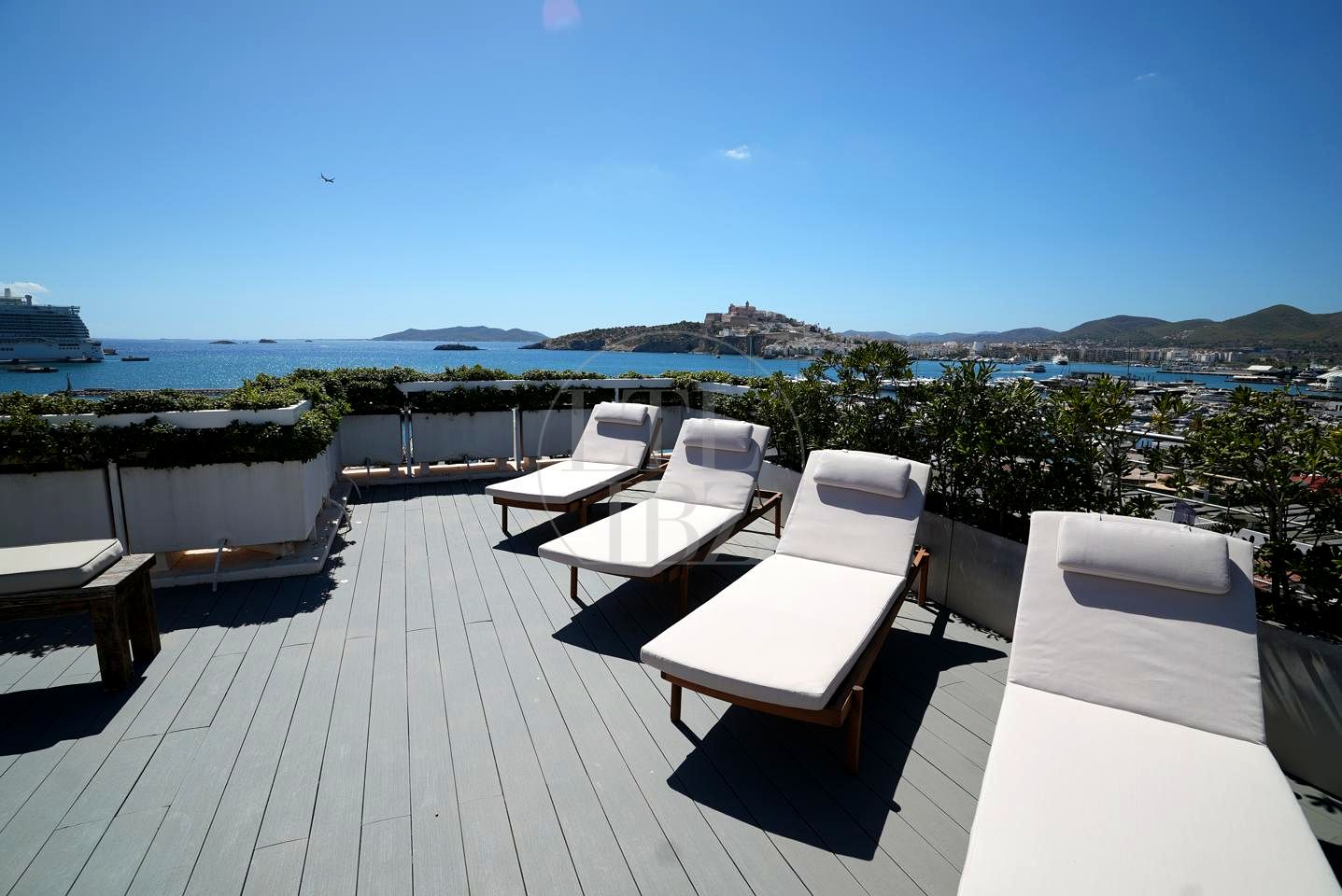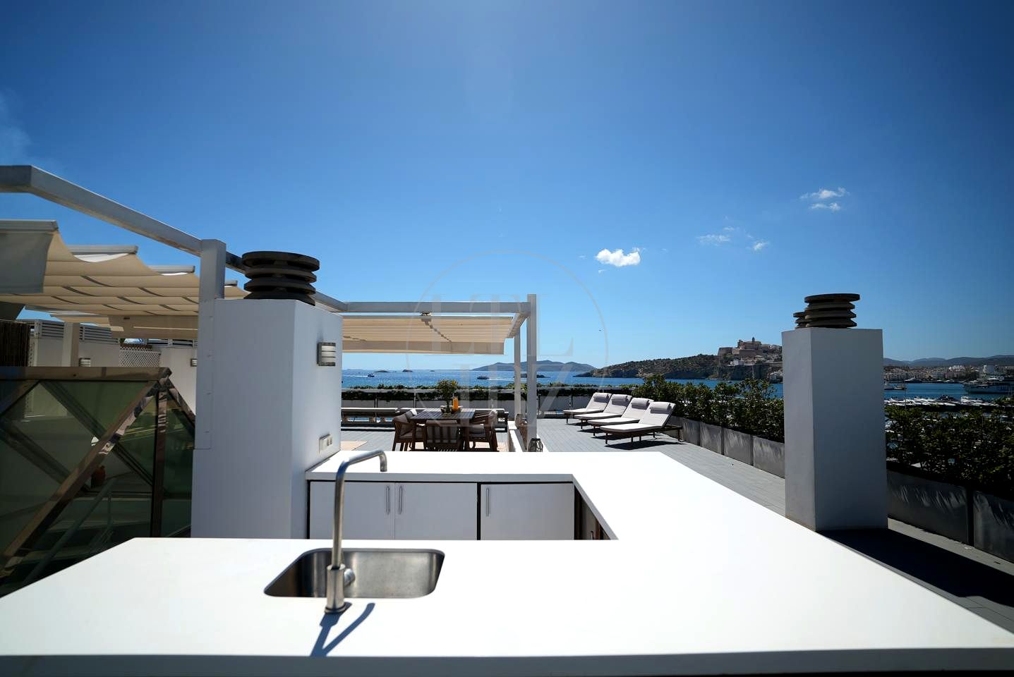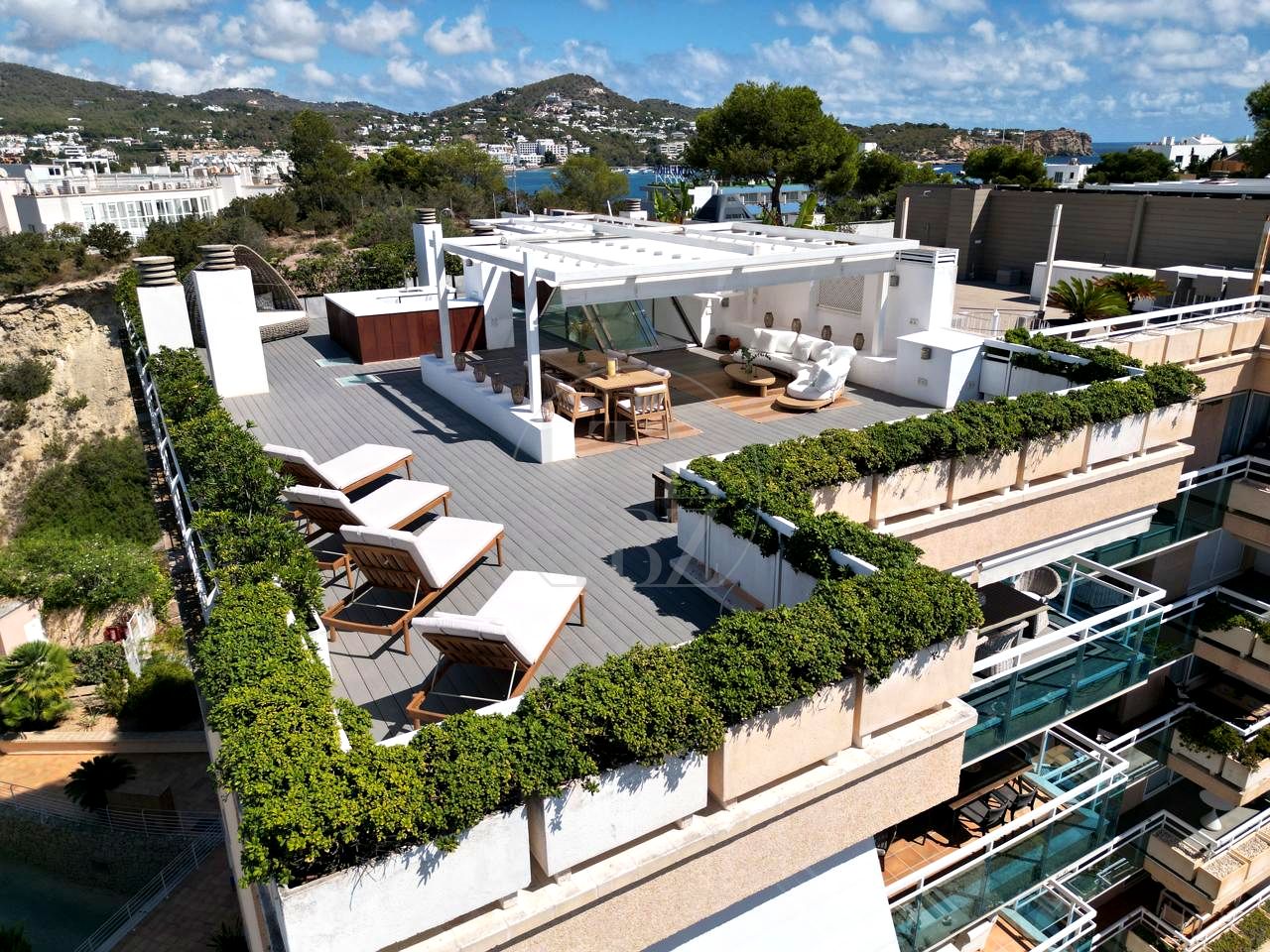 Penthouse with Panoramic Sea Views and Private Rooftop in S’Illa Plana, Ibiza offers an exceptional opportunity to acquire a contemporary residence in one of the island’s most exclusive coastal areas. The property enjoys a privileged position between Marina Botafoch and Talamanca, boasting breathtaking views over the harbour, the Mediterranean Sea, and Dalt Vila.